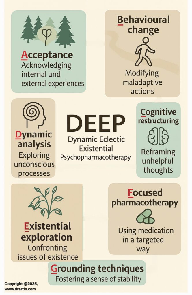 Meaning and Purpose: Existential psychiatry strongly emphasises the search for meaning and purpose in life. Mental health difficulties may be viewed as linked to a lack of meaning or an existential crisis, and therapy may focus on helping individuals find or create meaning in their lives.